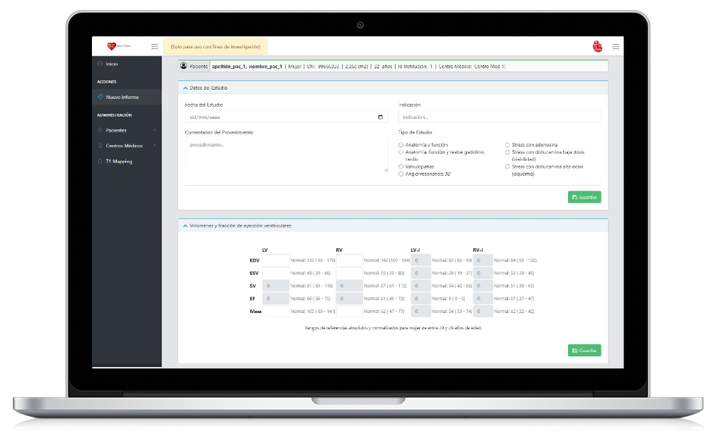 SmartCardio proporciona textos descriptivos en base a datos estructurados de tablas, rangos de valores normales y patológicos y facilita el cálculo de parámetros volumétricos.